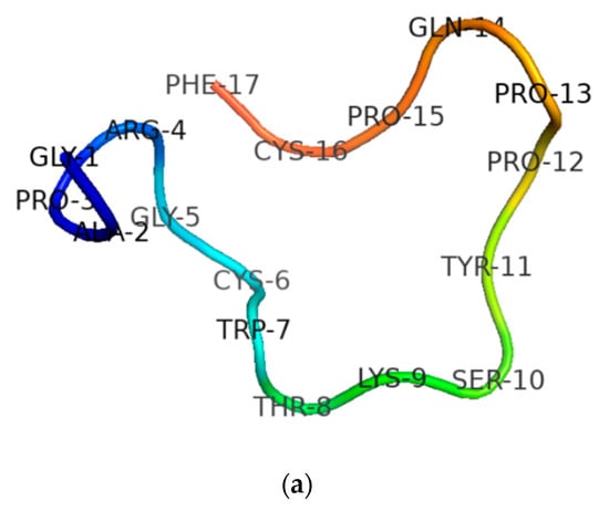 Predicted secondary structures of ranacyclin-T (a) and RNF (b), obtained from I-TASSER (https://zhanglab.ccmb.med.umich.edu/I-TASSER/) [].