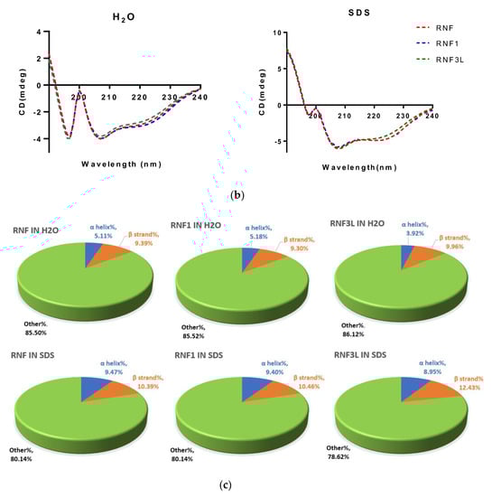 (a) Predicted secondary structure of RNF; (b) secondary structures of RNF (red lines), RNF1 (blue lines) and RNF3L (green lines) measured in ddH2O and 30 mM SDS buffers; and (c) proportion of different secondary structure domains predicted and calculated by K2D3.