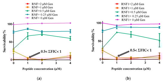Combinations of an antibiotic (Gentamicin) with either RNF or one of its analogues, improved the activity of the peptides against MRSA (Figure 5). As shown in the following figure, the MIC of Gentamicin against MRSA was 2 µM. In the presence of RNF and its analogues, the MIC of Gentamicin against MRSA was reduced to 1 µM. Since RNF and its analogues showed no obvious inhibitory activity against MRSA at 512 µM, the lowest cumulative fractional inhibitory concentration (ΣFIC) would be between 0.5 and 1, indicative of an additive effect between peptide and Gentamicin. The best combination of peptide with Gentamicin was 1 µM with 1 µM, respectively.