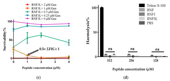 The additive effect against the growth of MRSA between Gentamicin (Gen) and: (a) RNF; (b) RNF1; and (c) RNF3L. (d) Haemolysis of RNF, RNF1 and RNF3L at 128, 256 and 512 µM. PBS and 1% Triton X-100 were set as negative and positive controls, respectively.