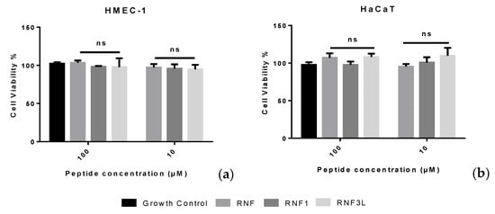 The cytotoxicity of (RNF) RNF1 and RNF3L: on HMEC-1 cells (a); and on HaCaT cells (b).