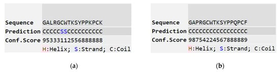 Bowman–Birk inhibitors (BBIs) exist in a wide range of plants including sunflowers, soybeans, legumes and so on []. They are classical serine proteinase inhibitors that contain a highly-conserved disulphide loop structure consisting of nine residues (CTP1SXPPXC) [,,]. BBI peptides derived from amphibians are slightly different and typically contain a disulphide-bridged hendecapeptide loop (CWTKSXPPXPC), containing 11 residues rather than nine residues [,]. For all natural trypsin-inhibition domains, the residue at the P1 position is lysine or arginine, whereas the P1 residue is typically leucine or tyrosine in chymotrypsin inhibitory domains []. BBIs have been extensively studied and found to have a wide range of functions, such as anti-inflammatory, anticancer and anti-bacterial. In addition, compared to most antimicrobial peptides (AMPs), BBIs are safe orally-active peptides whose therapeutic effects have been proven in animal models []. A thorough understanding of BBIs and their therapeutic potential could help in their further development as clinical agents.