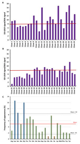 (A,B) Specific binding of the 50 clones isolated from the pool of the 3rd round of panning, determined by the ratio between the binding to the extracellular domain of low-density lipoprotein receptor (ED-LDLR) relative to bovine serum albumin (BSA) (see Figure S1). (A) Clones 1 to 24. (B) Clones 25 to 50. (C) Frequency of amino acids in the 13 different peptide sequences obtained after DNA sequencing.