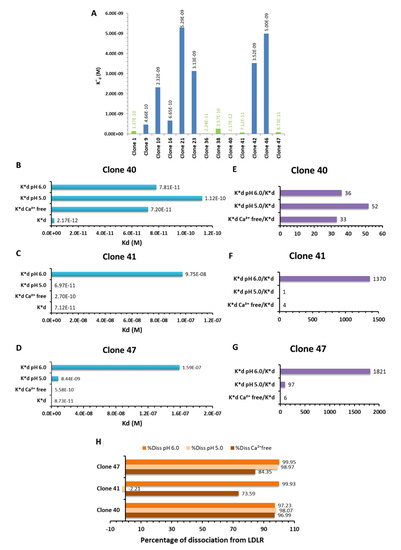 Binding of selected clones to ED-LDLR in various experimental conditions. (A) Apparent dissociation constants (K*d) of the 13 representative clones selected from the phage display experiments. Clones with low K*d, revealing high affinities and selected for further characterization, are in green. (B–D) K*d of the clones 40, 41, and 47 in normal conditions, at acidic pH (pH 6.0, pH 5.0), and in the absence of calcium (Ca2+ free). (E–G) Ratios between K*d in modified conditions and K*d of the clones, reflecting the inhibitory effects of these modifications on the clones binding. (H) Percentage of dissociation of the clones from the LDLR.