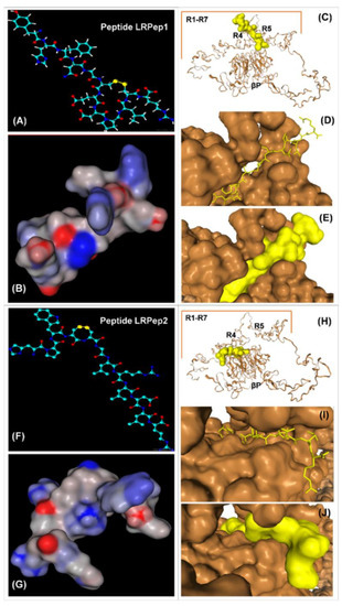 Computational three-dimensional structure (A,F) and spatial conformation (B,G) of peptides LRPep1 (A,B) and LRPep2 (F,G). The three-dimensional structures of peptides were drawn with ACD/ChemSketch 2.0 software. The peptides are represented with disulfide bridges that could occur in oxidizing conditions between the pairs of Cys (in yellow in A and F). Their spatial conformations were obtained with MarvinSketch 19.2 software (2019, http://www.chemaxon.com). Interaction of LRPep1 (C–E) and LRPep2 (H–J) with ED-LDLR was predicted using the HPEPDOCK program of blind peptide-protein docking (http://huanglab.phys.hust.edu.cn/hpepdock/) [16]. The binding regions of peptides to ED-LDLR are zoomed-in figures D–E (LRPep1) and I–J (LRPep2) to better observe the docking models. LRPep1 and LRPep2 appear in yellow, and ED-LDLR in orange. LRPep, LDL receptor-peptide.