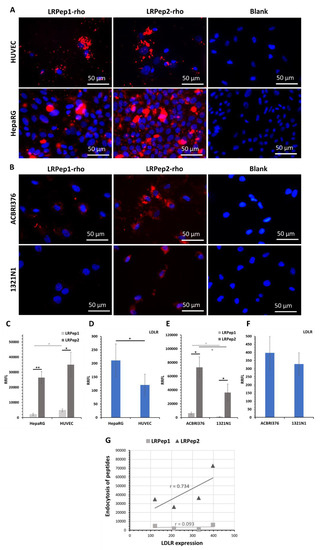 Endocytosis of the peptides LRPep1-rho and LRPep2-rho (stained in red) in (A) HUVEC and HepaRG cells and (B) ACBRI376 and 1321N1 cells. Nuclei are stained in blue with Hoechst. (C–F) The endocytosis of peptides, as well as the expression of LDLR, was semi-quantitatively evaluated by the measurement of fluorescent labeling using the ImageJ software and was normalized to the number of cells and to the background, giving the relative ratio of fluorescent labeling (RRFL); *: p < 0.05, **: p < 0.001. (G) The correlation coefficient between the expression of LDLR and the endocytosis of peptides.