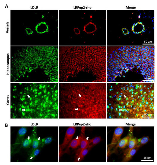 Colocalization of LRPep2-rho with LDLR on mouse brain slices (A) and ACBRI376 cells (B). LRPep2 appears in red due to the coupled rhodamine, LDLR is stained in green with fluorescein, and nuclei in blue with DAPI. White arrows highlight examples of colocalization areas.