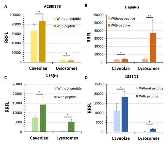 Semi-quantitative analysis of fluorescent labeling of caveolae and lysosomes when ACBRI376 (A), HepaRG (B), N18(H) (C), and 1321N1 (D) cells were incubated or not with peptide LRPep2 by the measurement of the RRFL. *: p < 0.05, **: p < 0.001.