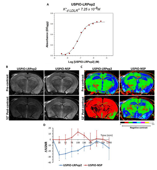 The peptide LRPep2 was grafted to USPIO (USPIO-LRPep2) in order to evaluate in vivo its ability to access into the brain. First, the affinity of USPIO-LRPep2 for ED-LDLR was evaluated by determining its K*d by ELISA (Figure 7A), showing a good affinity in the range of nanomolar (K*d = 7.25 × 10−8 M) and proving the ability of USPIO-LRPep2 to target LDLR. However, its lower affinity compared to that of LRPep2 displayed by phages (K*d = 8.73 × 10−11 M) could be attributed to a different number of peptides exposed by each supramolecular entity, i.e., 1–2 peptides/USPIO and 5 peptides/phage, respectively.