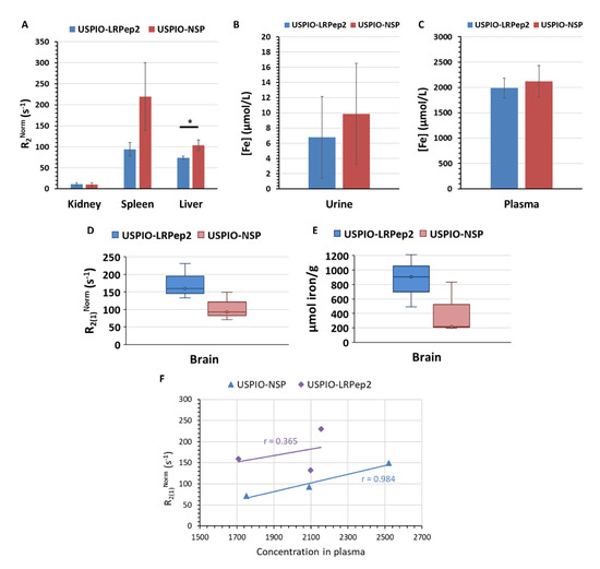 Biodistribution of USPIO-LRPep2 and USPIO-NSP at 55 min post-injection. (A) R2Norm (=1/T2Sample − 1/T2Control) for each USPIO derivative in the kidney, the spleen, and the liver. * p < 0.05. (B,C) Iron concentration (µmol/L) in urine and plasma, respectively. (D) R2(1)Norm for each USPIO derivative in the brain. (E) Iron concentration (µmol/g of dried tissue) in brains after digestion in acidic conditions. (F) Correlation coefficients between the R2(1)Norm of USPIO derivatives in the brains and their concentrations in the blood.