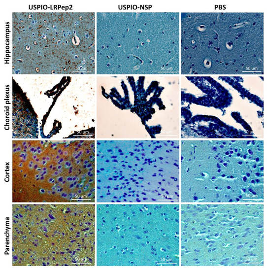 USPIO-LRPep2 and USPIO-NSP were detected on mouse brain slices by the Perls’-DAB staining, highlighting the iron present within these nanoparticles, and thus the in situ presence of USPIO derivatives (Figure 9). We observed brown staining for mice injected with USPIO-LRPep2 in different areas of brain slices (hippocampus, choroid plexus, cortex, and parenchyma in the hippocampus area), whereas no staining was visible on brain slices of mice injected with USPIO-NSP. This last result, identical to that obtained for mice injected with PBS used as a negative control, suggested that USPIO-NSP quantity that penetrated the brain tissue was inferior to the detection limit of this method. Moreover, the iron detected by NMR, as shown above in Figure 8, could probably be attributed to the residual USPIO-NSP, present in capillaries or the non-specific brain infiltration, as discussed previously; the Perls’-DAB staining revealed that USPIO-NSP did not bind the brain tissue.