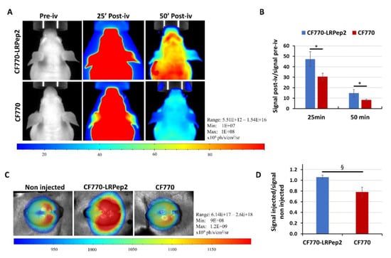 (A) FLI images of the brains of nude mice before (pre-iv) and after injection of CF770-LRPep2 or CF770 (post-iv). (B) Analysis of the fluorescence observed on FLI images, measured by the M3Vision software in the brain area, and normalized to the pre-iv signal. * p < 0.05. (C) FLI images of mouse brains ex vivo. (D) Analysis of the fluorescence of the brains ex vivo normalized to the brain signal of a non-injected mouse. § p = 0.05.