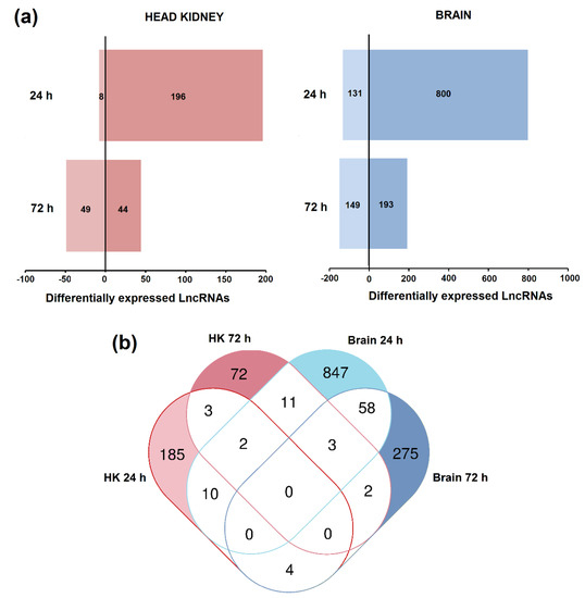 - Valenzuela-Muñoz, V.; Valenzuela-Miranda, D.; Gallardo-Escárate, C. Comparative analysis of long non-coding RNAs in Atlantic and Coho salmon reveals divergent transcriptome responses associated with immunity and tissue repair during sea lice infestation. Dev. Comp. Immunol. 2018, 87, 36–50. [Google Scholar] [CrossRef] [PubMed]