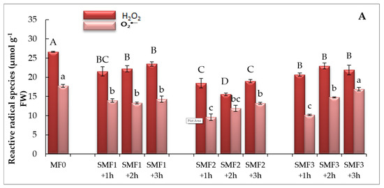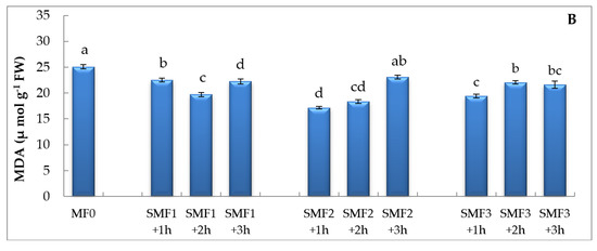 Effect of different intensities of the static magnetic field (SMF) for three exposure periods on the (A) H2O2 and O2− and (B) malondialdehyde (MDA) contents of lettuce. Different letters indicate statistically significant values following Duncan’s multiple range test at p < 0.05. Bars represent means of three (n = 3) replicates with standard errors (SEs). SMF0 (control), SMF1 (0.44 T), SMF2 (0.77 T), and SMF3 (1 T). FW—fresh weigh; T—Tesla; h—hour.