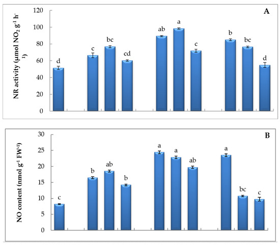 NO content was quantified by mixing the supernatant of fresh leaves homogenized in acetate buffer with Griess reagent [29,30].