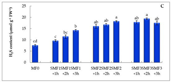 The application of SMF on seeds exhibited triggering of NR activity, and the paramount increase was recorded at MF2 for 2 h by about 47.69% relative to control (Figure 3). The application of magnetic therapy activated the pool of NO production whatever the exposure dose or time, and the highest increment was manifested at MF2 for 1 h and 2 h in comparison to other intensities (Figure 3). Moreover, SMF induced H2S content exacerbation, especially at SMF2 and SMF3 during the different exposure periods (Figure 3).