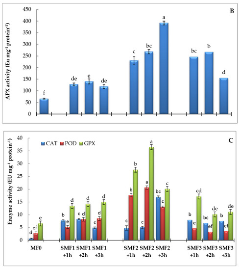 Effect of different intensities of the static magnetic field (SMF) for three exposure periods on the activities of (A) superoxide dismutase (SOD), polyphenol oxidase (PPO), and glutathione-S-transferase (GST); (B) ascorbate peroxidase (APX); and (C) catalase (CAT), peroxidase (POD), and glutathione peroxidase (GPX) of lettuce. Different letters of the same format indicate statistically significant values following Duncan’s multiple range test at p < 0.05. Bars represent means of three (n = 3) replicates with standard errors (SEs). SMF0 (control), SMF1 (0.44 T), SMF2 (0.77 T), and SMF3 (1 T). T—Tesla; h—hour.
