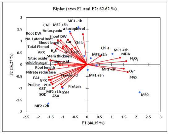 Effect of the static magnetic field (SMF) on the principal component analysis (PCA) of different variable relationships in lettuce. The PCA test identified 62.62% of the total variation, and axis 1 and axis 2 accounted for 46.35% and 16.27%, respectively. Growth parameters displayed positive correlations with H2S, NO, nitrate reductase, osmotic adjustments, and enzymatic and non-enzymatic antioxidants. DW (dry weight), Chl (chlorophyll), Car (carotenoids), H2O2 (hydrogen peroxide), MDA (malondialdehyde), NR (nitrate reductase), NO (Nitric oxide), hydrogen sulfide (H2S), SOD (superoxide dismutase), PPO (polyphenol oxidase), GST (glutathione-S-transferase), APX (ascorbate peroxidase), CAT (catalase), POD (peroxidase), GPX (glutathione peroxidase), ASA (ascorbic acid), GSH (reduced glutathione), PAL (phenylalanine ammonia-lyase), SMF0 (control), SMF1 (0.44 T), SMF2 (0.77 T), SMF3 (1 T), T (Tesla), and h (hour).