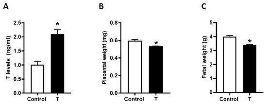 Plasma T levels and placental and fetal weights in control and T-treated pregnant rats. Pregnant rats were treated with vehicle (sesame oil) or T propionate from gestation day 15 to 19 and euthanized on day 20. (A) Plasma T levels were quantified using ELISA. (B) Placental and (C) Fetal weights were measured. Data presented as mean ± SEM of 6 rats in each group. * p < 0.05 vs. control.