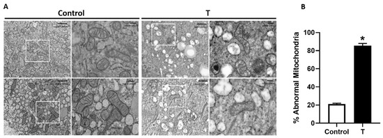Characterization of mitochondrial structure in the placenta. (A) Representative electron micrographs of placental mitochondria from control (left) and T-treated pregnant rats (right). Images show less abundant mitochondria and abnormal mitochondrial structure with condensed matrix and cristae in the placenta of T-treated rats. (B) Quantification of the percentage of morphologically abnormal mitochondrial showing condensed matrix and cristae in the placenta of control and T-treated rats. n = 4 in each group. * p < 0.05 vs. control.