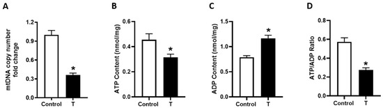 Mitochondrial copy number and ATP levels in the placenta of control and T-treated pregnant rats. (A) Mitochondrial DNA copy number was quantified using qRT-PCR based analysis. Placental (B) ATP and (C) ADP content was quantified using ApoSENSOR ADP/ATP kit. (D) Measurement of the ATP/ADP ratio. Data presented as mean ± SEM of 6 rats in each group. * p < 0.05 vs. control.