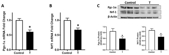 Expression of mitochondrial biogenesis indicators in the placenta of control and T-treated pregnant rats. Real-time PCR was used to assess (A) Pgc-1a and (B) Nrf1 mRNA expression in the placenta. Quantitation of placental Pgc-1a and Nrf1 mRNA expression was normalized relative to β-actin. (C) Representative Western blots for Pgc-1α, Nrf1, and β-actin are shown at top; blot density obtained from densitometric scanning of Pgc-1α and Nrf1 normalized to β-actin is shown at the bottom. Data presented as means ± SEM of 6 rats in each group. * p < 0.05 vs. control.