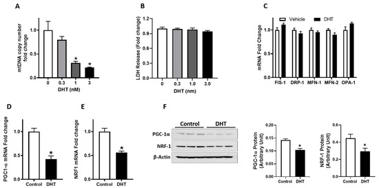 Mitochondrial copy number and expression of fission/fusion and biogenesis indicators. Trophoblasts cells were treated with vehicle (ethanol) or dihydrotestosterone (DHT) for 24 h. (A) Mitochondrial DNA copy number was quantified using qRT-PCR based analysis. (B) Cell viability after exposure to DHT was assessed using lactate dehydrogenase (LDH) cytotoxicity assay. The LDH levels were measured and expressed as the fold change compared to vehicle control. Real-time PCR was used to assess the relative mRNA expression levels of (C) fission/fusion genes (FIS-1, DRP-1, MFN-1, MFN-2, and OPA-1), and biogenesis indicators (D) PGC-1α and (E) NRF1, normalized to β-actin. (F) Representative Western blots for PGC-1α, NRF-1, and β-actin are shown at the left; blot density obtained from densitometric scanning of PGC-1α and NRF-1 normalized to β-actin is shown at the right data presented as means ± SEM of 4 biologically independent replicates. * p < 0.05 vs. control.