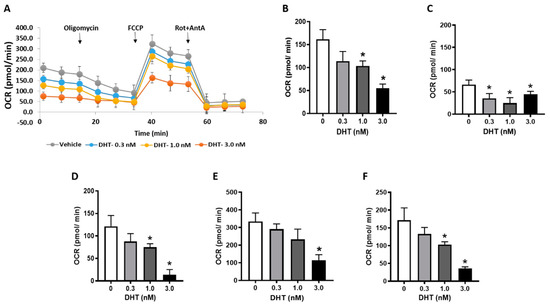 The addition of FCCP allows for an estimation of the maximum OCR. FCCP is an ionophore that directly transports protons across the inner mitochondrial membrane instead of via the ATP synthase proton channel. Hence, the addition of FCCP collapses Δψm, leading to the rapid consumption of oxygen without the generation of ATP. DHT exposure produced a dose-dependent decrease in the maximum respiratory rate (Figure 6E). In parallel, the spare respiratory capacity also decreased with increasing DHT concentrations (Figure 6F).