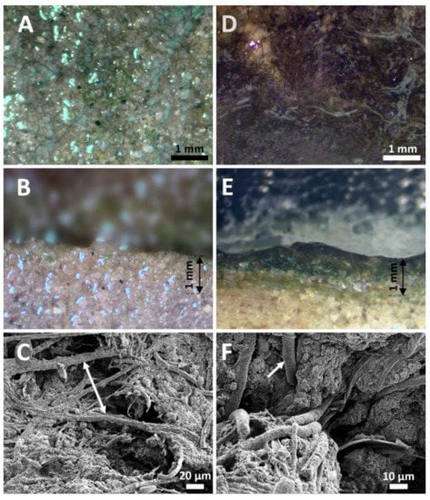 Light photographs and SEM images of submerged (A,B,C) and dry (D,E,F) mats. (A) Surface of a submerged, poorly developed mat with multitrichal filaments of the dominant species Coleofasciculus chthonoplastes. Note limited cyanobacterial coverage. (B) Cross section of the submerged mat with barely seen surface layer of cyanobacteria. Some filament occurred within the mat between the sand grains, at depths of ~0.2 mm due to active locomotion of C. chthonoplastes. (C) SEM image of the submerged mat with threads of C. chthonoplastes embracing mineral’s particles. (D) Surface of a dry, well developed mat with abundant filaments of the “Lyngbya” sp. covering almost 95% of area. (E) Cross section of a dry mat with visible colonies of “Lyngbya” sp. on the surface and blue-green layer underneath with other filamentous taxa. Note that the mat has pigmentation/coloration all the way down to 1 mm compared to thinner mats in submerged mat. (F) SEM picture of a dry mat with large rounded filaments of “Lyngbya” sp. having short discoid cells.