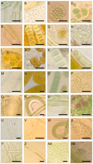 Representative morphologies of cyanobacterial taxa identified using light microscopy. (A) Anagnostidinema sp., a filamentous cyanobacterium with rounded end. (B) Aphanocapsa sp., a coccoid form with thick mucilage covering the colonies. (C) Aphanothece sp., a coccoid cyanobacterium with thin layer of mucilage. (D) Chroococcus sp., a coccoid form with thick mucilage covering each cell. (E) Coleofasciculus chthonoplastes (Thuret ex Gomont) M. Siegesmund et al., a filamentous form with tapered end and thick sheath covering the trichomes. (F) Cyanocohniella sp., a thermal cyanobacterium that was originally isolated from thermal springs. (G) Cyanosarcina sp., a unicellular-colonial, usually 2–16-multicelled cyanobacterium. (H) Eucapsis prescottii (Drouet et Daily) Komárek et Hindák, a unicellular-colonial, irregular, and diffluent mucilage-forming cyanobacterium. (I) Gloeocapsa sp., a unicellular-colonial cyanobacterium in a form of irregular aggregations with brown sheath. (J) Gloeocapsopsis sp., a less spherical unicellular-colonial cyanobacterium with brown sheath. (K) Johannesbaptistia pellucida (Dickie) W. R. Taylor et Drouet., a unicellular-pseudofilamentous taxon, that possessed a gelatinous sheath. (L) Kamptonema sp., an unsheathed cyanobacterium with rounded ends. (M) Leibleinia sp., a thin sheath-covered filamentous cyanobacterium that tangled in old stages. (N) Lyngbya sp., a filamentous cyanobacterium with brown sheath. (O) Lyngbya sp. with a thickened outer cell wall at the end cell. (P) Nodosilinea sp., a filamentous cyanobacterium with nitrogen-fixing potentials. (Q) Oscillatoria nigro-viridis Thwaites ex Gomont, a motile filamentous cyanobacterium. (R) Perforafilum tunnelli, a tapered-ended, sometimes hooked-ended, filamentous cyanobacterium with boring ability. (S) Phormidium sp., a filamentous cyanobacterium with tight sheath. (T) Pleurocapsa sp., a cyanobacterium that is unicellular-pseudofilamentous and crust-like, composed of irregular groups of cells. (U) Porphyrosiphon sp., a tapered-ended filamentous cyanobacterium with a firm and thick sheath. (V) Pseudanabaena sp., a filamentous cyanobacterium. (W) Schizothrix sp., a filamentous colonial cyanobacterium. (X) Spirulina tenerrima Kützing ex Gomont., a filamentous screw-like cyanobacterium. (Y) Stenomitos sp., a rounded-ended filamentous cyanobacterium. (Z) Symplocastrum sp., a filamentous cyanobacterium. (AA) Synechococcus sp., a unicellular-colonial, oval-shaped cyanobacterium without mucilage. (AB) Xenococcus sp., a unicellular-colonial cyanobacterium containing mucilaginous sheath. Scale bar in each figure represents 10 µm.