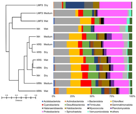 The complete OTU table is summarized in the supplemental material (Table S1). According to principal coordinate ordinations (Figure S1), microbial communities of KRS and KRN sample sites (all conditions) tended to group together; however, that trend was not significant. The dry and medium sites of NH grouped with KR sample sites, supporting the idea that dry sites within LMFS and NH are taxonomically similar to wet sites in KR. The microbial community from the sand flats of the Laguna Madre were dominated by members of the phyla Proteobacteria and Bacteroidota, which collectively accounted for 20–60% of OTU relative abundance (Figure 4). Bray–Curtis dissimilarity index showed that the LMFS-dry site had a unique microbial composition dominated by Firmicutes and Proteobacteria, whereas the microbial compositions of the other three dry sites were similar. All sites in KR shared similar microbial composition at the phyla level to the two NH sites, i.e., NH-medium and NH-dry. KRN-wet sites were dominated by Chloroflexi, followed by Proteobacteria and Bacteroidota. According to MiSeq analysis, 50 microbial phyla were identified from KR mats. Members of the phylum Cyanobacteria represented less than 15% of the total relative abundance of the microbial community from all sample sites and all conditions (Figure 4); the KRS-medium wetness site had the largest Cyanobacteria abundance, which was double the next closest site (KRN-dry).