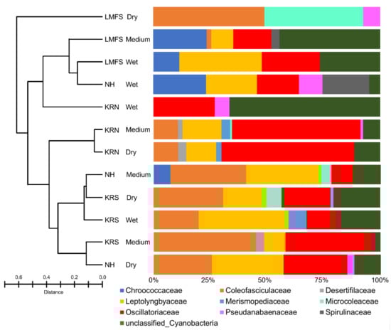 Species in the cyanobacterial families Coleofasiculaceae and Oscillatoriaceae were the most abundant in the mats, accounting for 25–85% (average 46%) of the cyanobacteria OTUs (Figure 5). The dry site at LMFS was the only site that did not contain species of Oscillatoriaceae. Unlike the Oscillatoriaceae, species in the Coleofasiculaceae were mostly found in dry areas. Coleofasiculaceae were either not found or present in low OUT abundance (<20%) in samples from all four wet sites across the Laguna Madre, i.e., KRN-wet, NH-wet, LMFS-medium and -wet. Leptolyngbyaceae were found in 10 sites, but not at KRN-wet and LFMS-dry. Microcoleaceae were only found in rare abundance at the other three low moisture sites, including NH-medium, KRN-medium, and KRS-dry. Chroococcaceae and Spirulinaceae were only found in LFMS and NH, whereas Merismopediaceae were only found in KR sites.