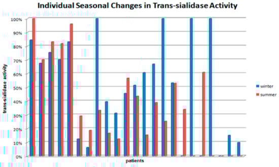 We studied enzymatic trans-sialidase activity in blood serum samples during summer and winter periods. Samples incubated without sialic acid acceptor were an indication of sialidase activity, while samples incubated with desialylated fetuin indicated combined sialidase and trans-sialidase activity. We used the difference in percentage of labeled sialic acid transferred from the gel into a solution between samples with sialic acid acceptor and samples without sialic acid acceptor as a way to represent trans-sialidase activity in serum.