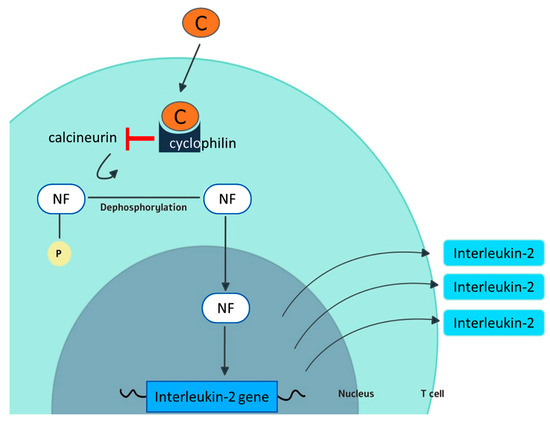 Mechanism of action of cyclosporine. In the cytoplasm of T cells, cyclosporine (C) forms a complex with cyclophilin. The cyclosporine–cyclophilin complex interferes with the phosphatase activity of the enzyme calcineurin. As a consequence, calcineurin cannot dephosporylate the nuclear factor (NF) that limits IL-2 production by T cells and its full activation. Cyclophilin is also believed to be one of the targets for the antiviral activity of cyclosporine.