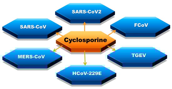 Coronaviruses affected by cyclosporine: severe acute respiratory syndrome coronavirus 2 (SARS-CoV2), severe acute respiratory syndrome coronavirus (SARS-CoV or SARS-CoV1), feline coronavirus (FCoV), Middle East respiratory syndrome coronavirus (MERS-CoV), transmissible gastroenteritis virus (TGEV), human coronavirus 229E (HCoV-229E).