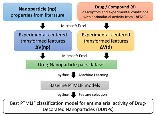 Figure 1 presents the methodology used to build the PTMLIF classifier for the antimalarial activity of DDNPs. The methodology flow contains the following steps: (1) Get 23 properties of nanoparticle and anti-malaria drugs/compounds from the literature and public databases as initial molecular descriptors; (2) Fuse information about experimental conditions and the properties of anti-malaria drugs/compounds and nanoparticles, using an experimental-centered transformation of the original features (Box–Jenkins Moving Average operators); (3) Integrate drug/compound and nanoparticle data into the study dataset; (4) Build the baseline PTMLIF models using default parameters of the ML methods; (5) Improve the performance of the best classifier by using only the most important features (feature selection).
