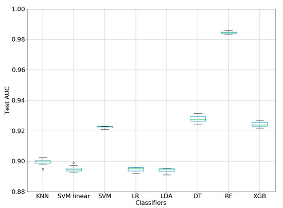 Using eight ML classifiers, the AUC values have been calculated (10-fold CV). The results are presented in Table 5. The best model was obtained with RF, and the AUC is 0.9844 ± 0.0007. Figure 2 represents the box-plot for the baseline AUC values of the ML methods (10-fold CV). The AUC values for the 10 splits have short ranges, especially RF. This suggests that the AUCs for all ML methods are stable within each fold. In addition, the high difference between the RF and the other methods (box-plots are far from overlapping) demonstrated that it is statistically significant.