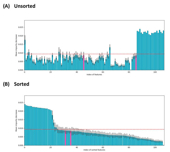 Figure 3 shows the mean impurity reduction for each of the features in both the original order and the sorted. This mean impurity decrease was obtained using an Extra Trees classifier with 100 trees and weighted classes, and this model was applied in a stratified 10-fold CV. The horizontal dashed line indicates the threshold used as a selection filter. After checking that the probability feature is present, since this is strictly necessary in Perturbation Theory, we check that all experimental conditions are reflected in the selected subset. After filtering, the experimental conditions, c2 and c4, of the nanoparticles were not included. Therefore, we selected the characteristic with the highest mean impurity decrease for both experimental conditions, and added it to the previous selection, marking them in pink. The unsorted plot presents the features on the x-axis in the order they were presented into the dataset. For a better comparison of the selected feature mean impunities (the ones above the cutoff), the ordered version of the plot was presented too.
