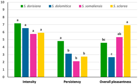 As for smell persistency, the highest value was attributed to S. dorisiana, followed by S. dolomitica and S. sclarea EO, with the lowest values attributed to the S. somalensis EO (Figure 1).