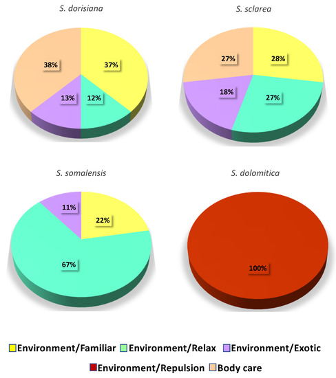 As for the possible use of the EOs, the assessors indicated that all the Salvia spp. EOs, with the exception of S. dolomitica, were suitable for “Environmental protection”, while only the S. dorisiana and S. sclarea were suitable also for “Body care” (Figure 2).