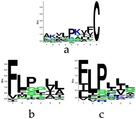Motif analysis of the selected sequences from Antimicrobial Peptide Database (APD3). The sequence cluster of (a) 9 amino acid residues before the rana box domain of 121 brevinin-1 peptides, (b) the N-terminal 6-mer peptide of selected brevinin-1 peptides, and (c) the N-terminal 6-mer peptide of 102 temporin peptides. The hydrophobic and positively charged amino acids are coloured by black and blue, respectively.