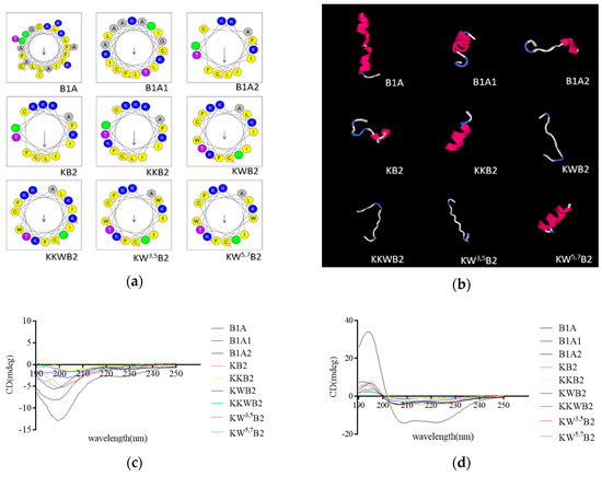 (a) Helical wheel representation of all peptides. (b) Predicted 3D models of all peptides circular dichroism (CD) spectra of B1A and its analogues. The peptides were tested in aqueous solution (c) and 1% SDS micelles solution (d), respectively.