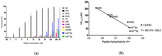 (a) The haemolytic activity of novel peptides (B1A) and its analogues on horse erythrocytes. Phosphate buffered saline (PBS) and 1% TritonX-100 were used as the negative control (NC) and positive control (PC), respectively; (b) relationship of peptide’s (KKB2, KB2, KKWB2, KWB2, KW5,7B2, and KW3,5B2) hydrophobicity and 10% haemolytic complement (HC10) on horse erythrocytes. Data represent means ± SD of five replicates.