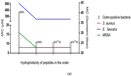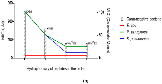 Relationship of peptides’ (KKB2, KWB2, KW5,7B2, and KW3,5B2) hydrophobicity in the order and MICs. (a) The geometric mean of the MICs for three gram-positive bacteria and their respective MICs. (b) The geometric mean of the MICs for three gram-negative bacteria and their respective MICs.
