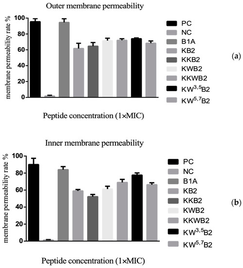 KB2 and its analogues (Figure 6) induced a similar level of E. coli inner and outer membrane permeability at their MICs. These results suggested that, even though the analogues had different antimicrobial abilities, at their MICs, they were all causing membrane permeabilisation.