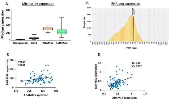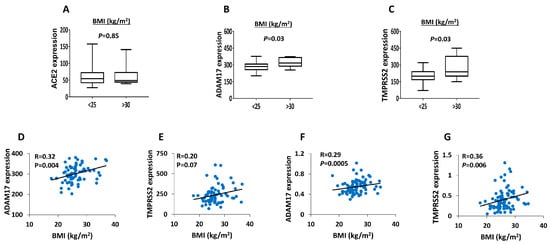 Likewise, we stratified the donors into normal (BMI < 25) and obese (BMI > 30) as a means of testing the effect of obesity on the expression of these receptors. The expression of ADAM17 and TMPRSS2 was significantly (p < 0.05) higher in obese donors compared to non-obese ones (Figure 4B,C). ACE2 showed no correlation (Figure 4A). Additionally, using the microarray and RNA-seq datasets, we found that ADAM17 and TMPRSS2 correlated positively with BMI values (Figure 4D–G).