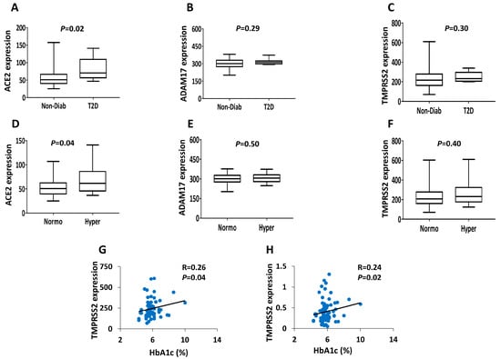 Next, we compared microarray expression data for ACE2, ADAM17 and TMPRSS2 between diabetic versus non-diabetic donors as well as between hyperglycemic (HbA1c ≥ 6%) versus normoglycemic (HbA1c < 6%) donors. As shown in Figure 2, the expression of ACE2 was significantly (p ≤ 0.05) upregulated in diabetic or hyperglycemic islets compared to non-diabetic or normoglycemic (Figure 2A,D). No significant differences were evident regarding the expression of ADAM17 and TMPRSS2 in relation to diabetes status and/or glycemic levels (Figure 2B–F). Likewise, we could not observe any differential expression of ADAM17 and TMPRSS2 in human islets using RNA-seq data (Not shown). Correlation analysis from microarray and RNA-seq expression data showed a positive association between TMPRSS2 and HbA1c (Figure 2G,H); no correlation was evident regarding the expression of ACE2 or ADAM17 with HbA1c levels. No associations were detected between the microarray expression of the three genes and measured insulin secretion of human islets (not shown).