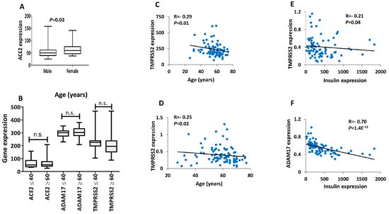 Impact of gender and age on expression levels of ACE2, ADAM17 and TMPRSS2 in human islets. (A) Microarray expression of ACE2 obtained from male donors (n = 45) versus females (n = 30). (B) Microarray expression of ACE2, ADMA17 and TMPRSS2 from donors ≤ 40 years old (n = 6) versus ≥ 60 years (n = 31). (C) Microarray expression correlation of TMPRSS2 with age (n = 76). (D) RNA-seq expression correlation of TMPRSS2 with age (n = 77). RNA-seq expression correlation of TMPRSS2 (E) or ADAM17 (F) with insulin gene expression (n = 85). N.S.; not significant. p- and R-values are shown as per the respective figure.