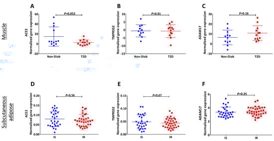 Microarray gene expression of ACE2, ADAM17 and TMPRSS2 in diabetic tissues. (A–C) Mean expression of ACE2 (A), ADAM17 (B) and TMPRSS2 (C) in muscle tissues obtained from diabetic and healthy donors. (D–F) Mean expression of ACE2 (D), ADAM17 (E) and TMPRSS2 (F) in subcutaneous adipose tissues obtained from diabetic and normal donors.