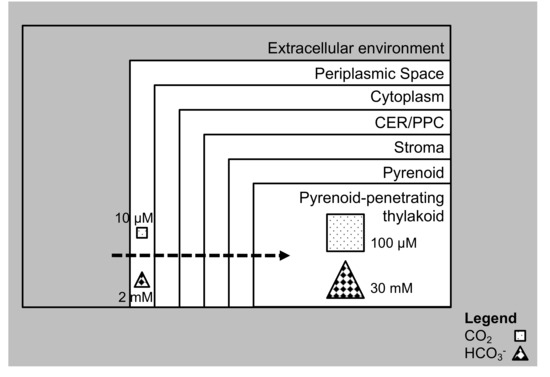 As carbon availability is often the limiting factor for microalgal growth, most microalgal chloroplasts contain a pyrenoid with a high concentration of RuBisCO, for an effective CCM [123]. In addition, CO2 responsive CAs occur in the pyrenoid of P. tricornutum [103]. For CO2 fixation by RuBisCO, the transported HCO3 has to be converted to CO2. CO2 can also be produced in P. tricornutum, by importing HCO3 into the pyrenoid-penetrating thylakoid lumen. There, the activity of θ-CA and the low pH converts HCO3 to CO2 for RuBisCO. β-CAs can also convert bicarbonate into CO2, thereby increasing the CO2 concentration around RuBisCO [101]. The amount of CO2 supplied to RuBisCO is fixed, but the rest of the CO2 leaks out of the chloroplast [96]. The leaked CO2 is recovered by CA-catalyzed conversion to HCO3 [82]. P. tricornutum lacks cytosolic and stromal CAs, but has numerous chloroplast envelope CAs. Such a design implies that the main recovery points of carbon are in the four-layered chloroplast envelope [103]. The essential pyrenoid component 1 (EPYC1) is a low complexity repeat protein which links RuBisCO to form the pyrenoid. EPYC1 is of comparable abundance to RuBisCO, and colocalizes with RuBisCO throughout the pyrenoid. EPYC1 is essential for normal pyrenoid size, number, morphology, RuBisCO content and efficient carbon fixation at low CO2. The most abundant proteins in the low CO2 pyrenoid fraction are RuBisCO large (rbcL) and small (rbcS) subunits, and RuBisCO activase (RCA1) [124]. It has been found that pyrenoid-based CCM emerges as the most effective in achieving the greatest elevation of CO2 [92]. CCMs increase the cellular CO2 concentration around RuBisCO, resulting in a higher carbon fixation rate in a CO2 limited environment. To avoid carboxylation/decarboxylation, and to ensure compartments in which CO2 can be concentrated for carbon fixation by RuBisCO, diatoms may utilize their pyrenoid and four-layered plastids [125].